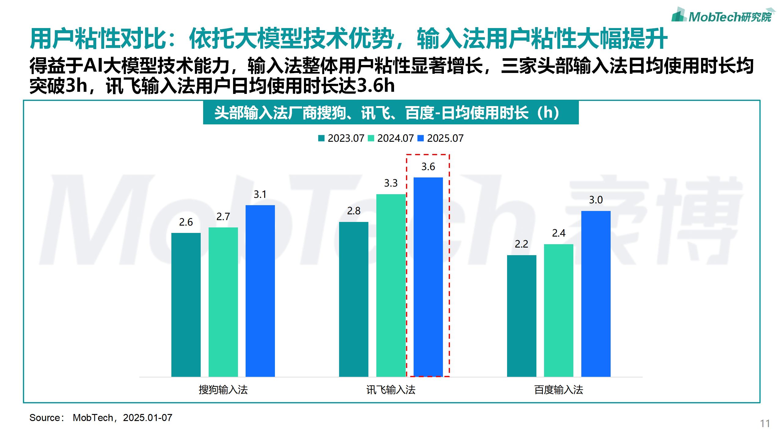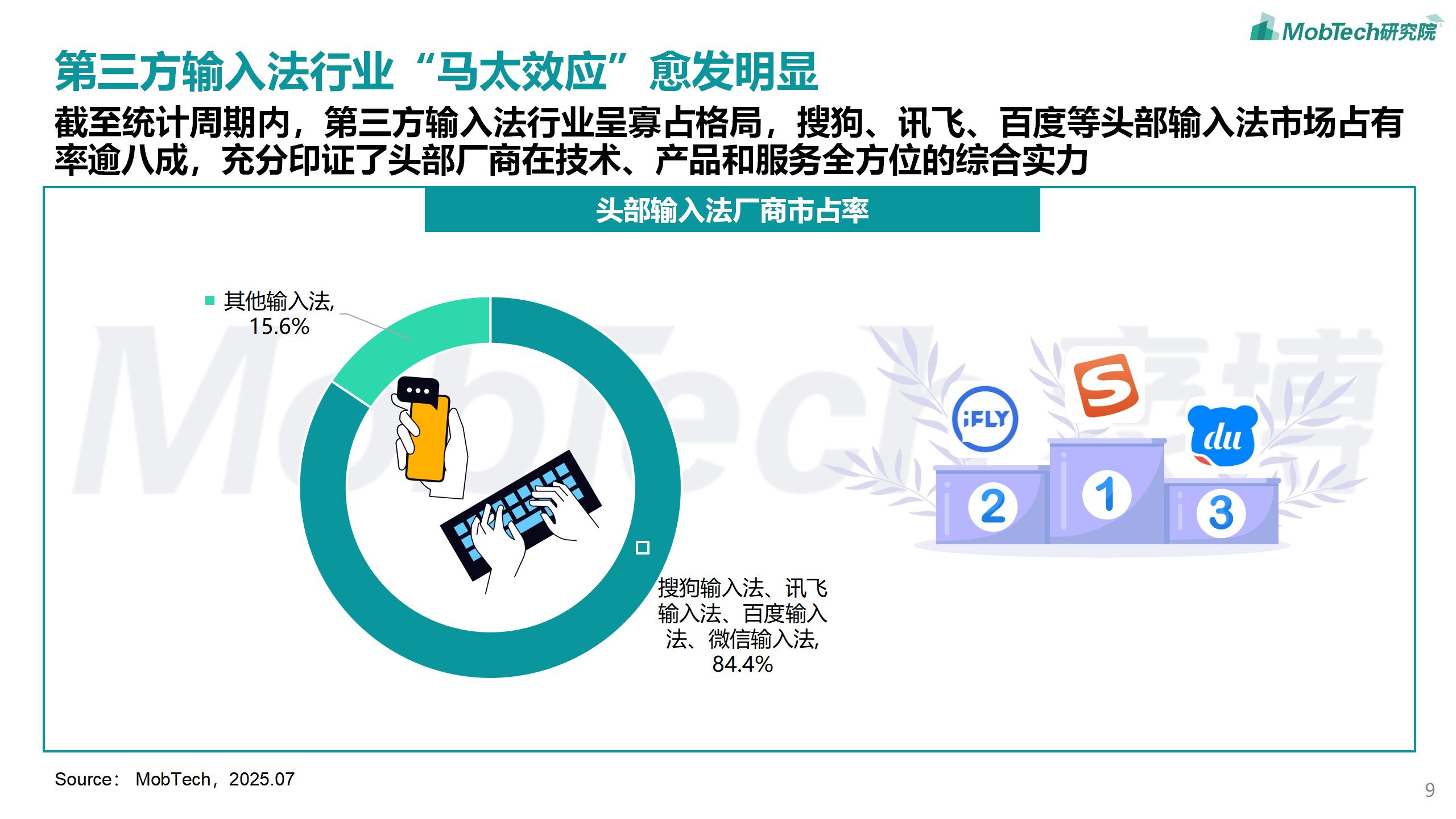 截至统计周期内,第三方输入法行业呈寡占格局,搜狗、讯飞、百度等头部输入法市场占有率逾八成,充分印证了头部厂商在技术、产品和服务全方位的综合实力;