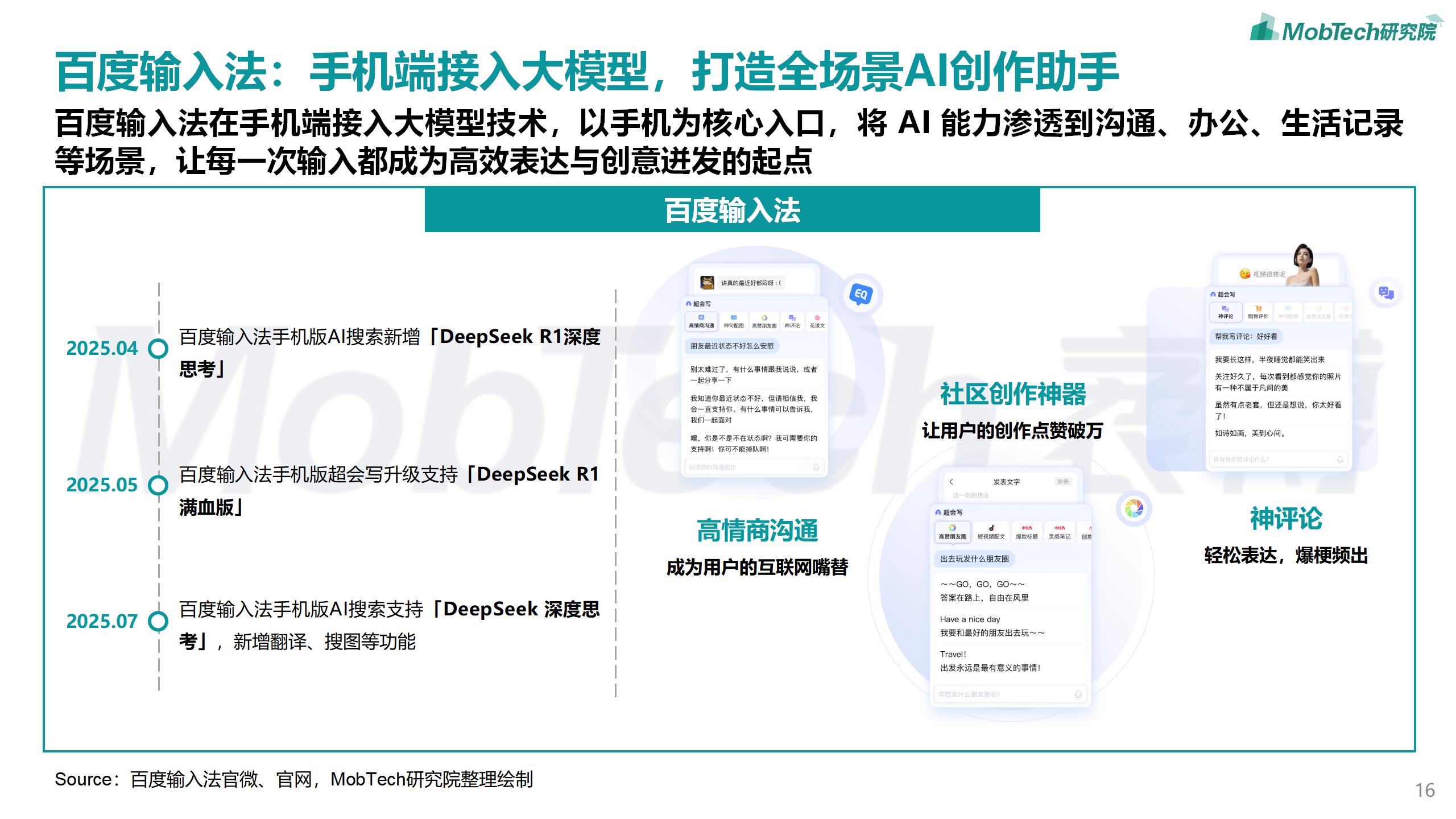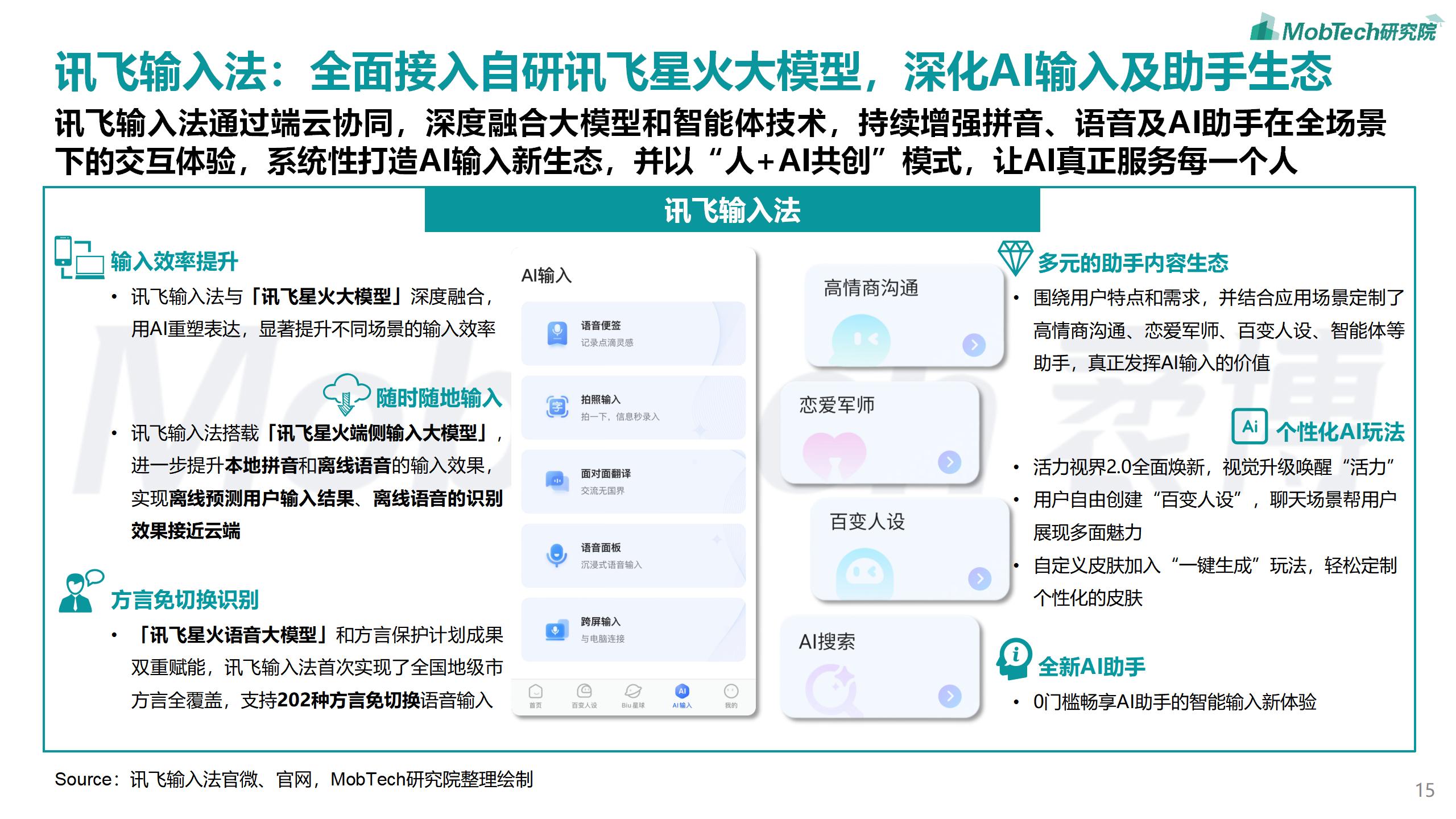 搜狗输入法通过输入即搜索、跨场景适配、个性化等功能大幅优化,迎来体验全面升级;讯飞输入法通过端云协同,深度融合大模型和智能体技术,持续增强拼音、语音及AI助手在全场景下的交互体验,系统性打造AI输入新生态,并以“人+AI共创”模式,让AI真正服务每一个人;百度输入法在手机端接入大模型技术,以手机为核心入口,将 AI 能力渗透到沟通、办公、生活记录等场景,让每一次输入都成为高效表达与创意迸发的起点。