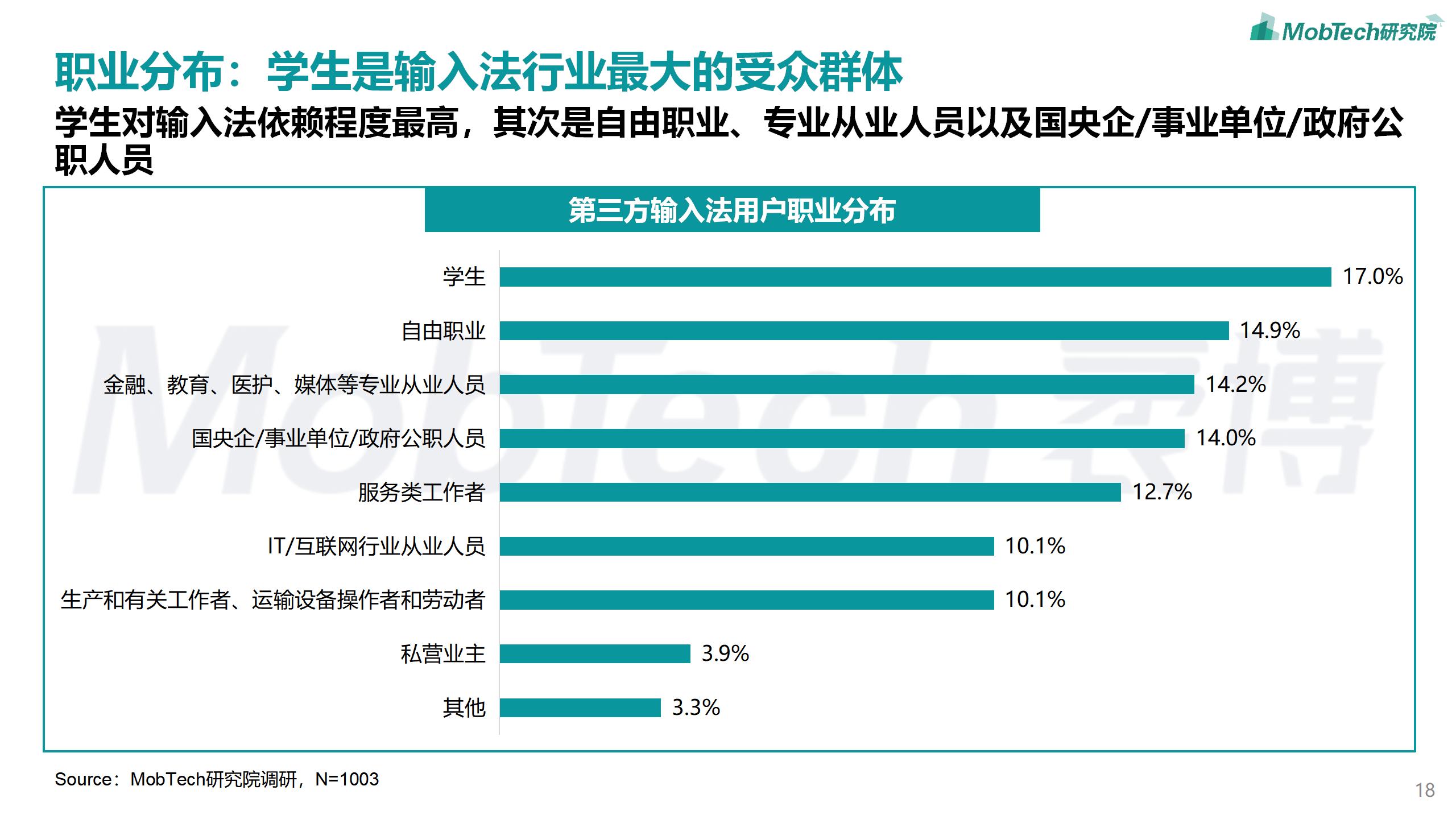 学生对输入法依赖程度最高,其次是自由职业、专业从业人员以及国央企/事业单位/政府公职人员;