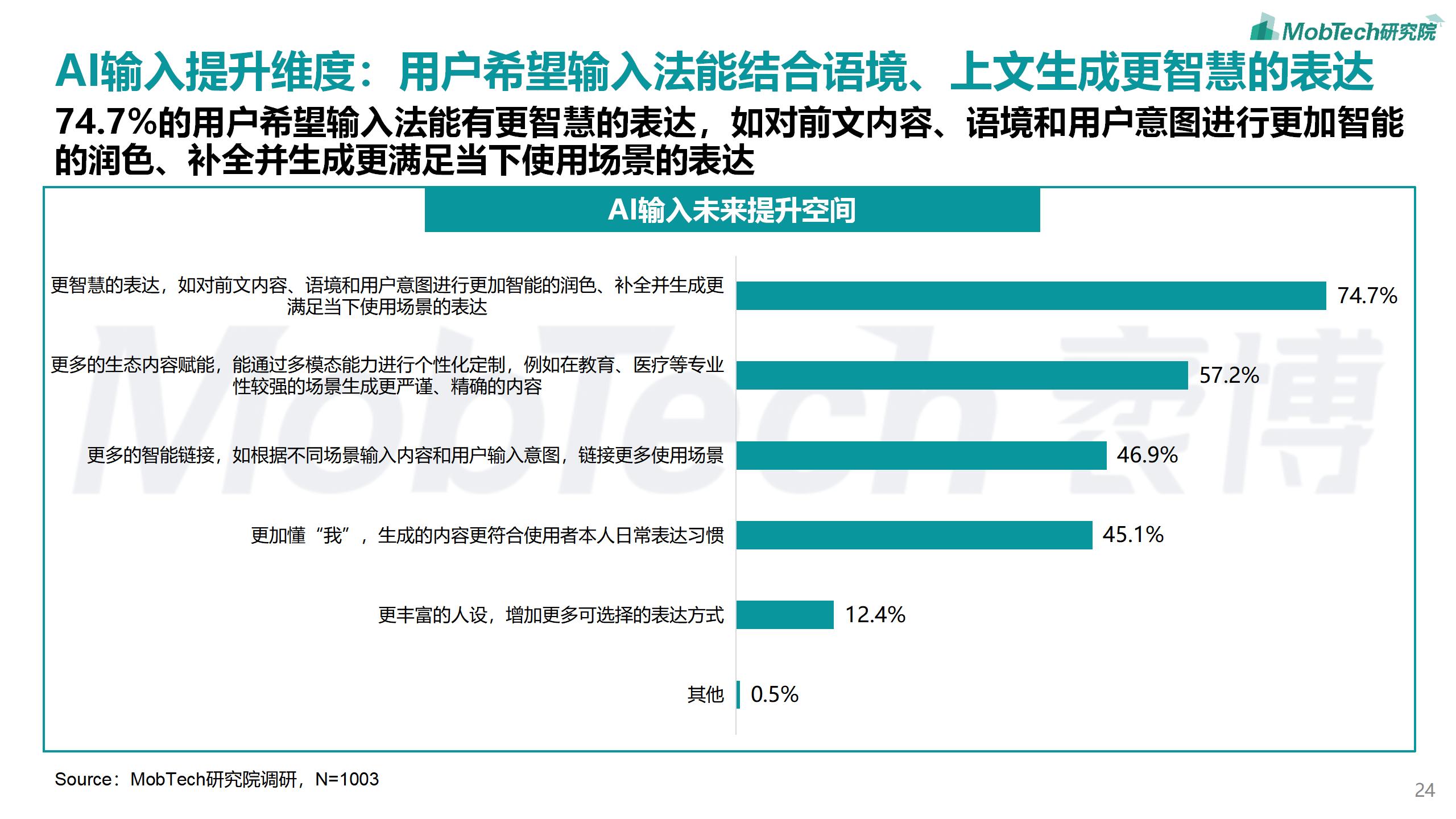 74.7%的用户希望输入法能有更智慧的表达,如对前文内容、语境和用户意图进行更加智能的润色、补全并生成更满足当下使用场景的表达。